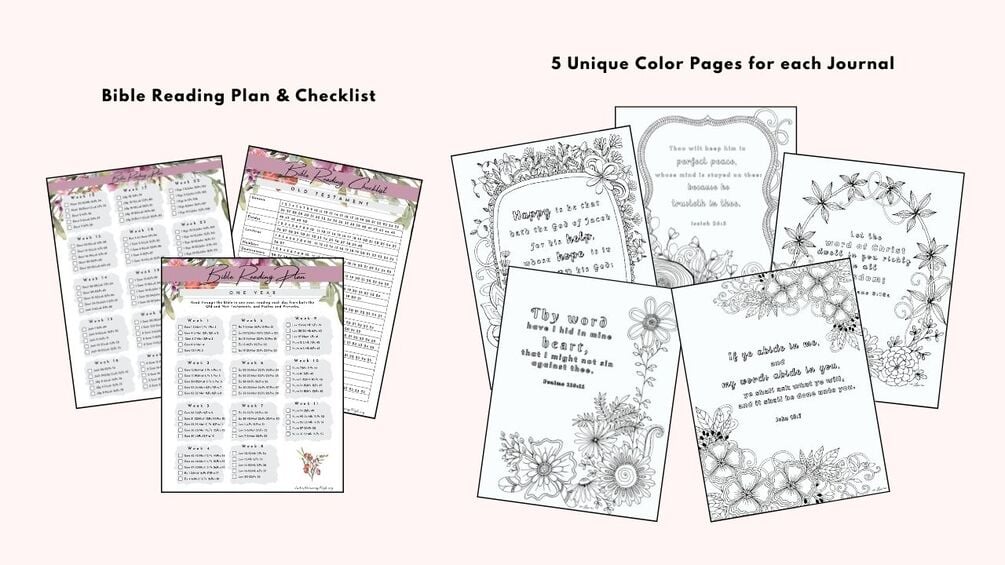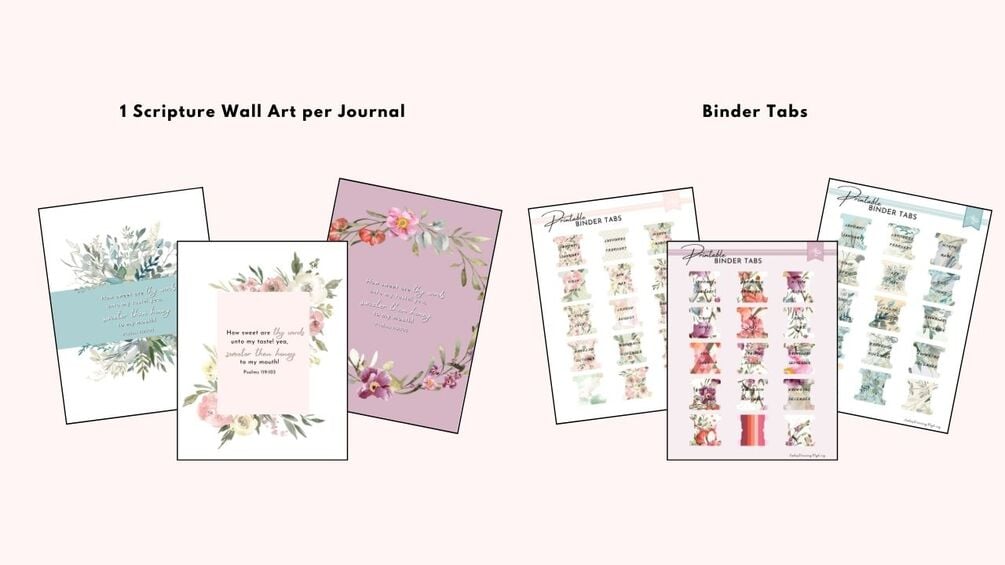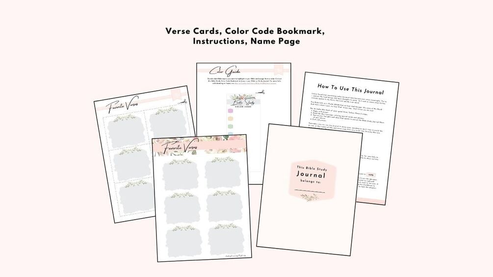 This printable bundle also includes 5 Scripture Coloring Pages, Verse Cards to write out your favorite verses from your reading, a Bible Study Color Code Bookmark, a Scripture Wall Art, and binder tabs for creating a beautiful binder to keep your journal organized.