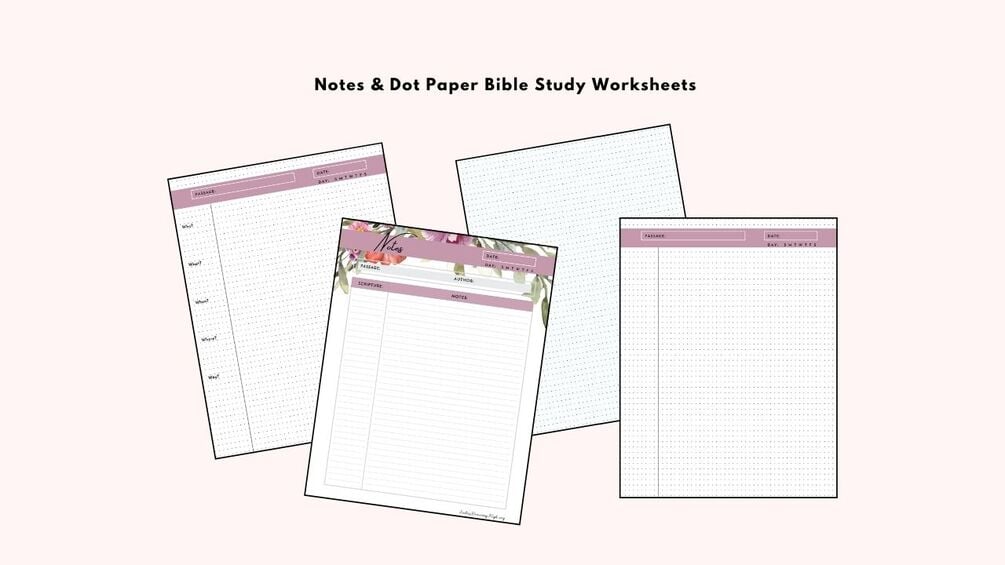 You might like to use the Notes page to jot down your thoughts about the verses as you read a passage. And then decide which verse(s) you want to focus on for further study and then go on to use one of the other study sheets (Verse, Word, Chapter, Book, Bible, Character). You can choose also between the guided Bible Study sheets, the mapping pages, or the dot paper pages!